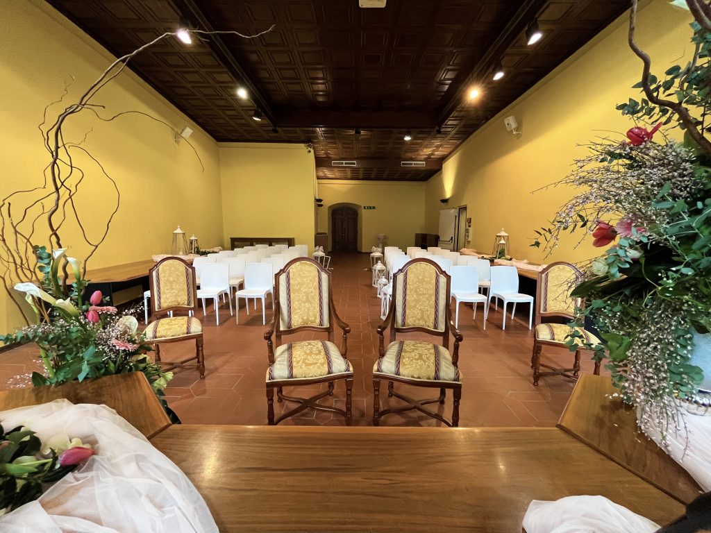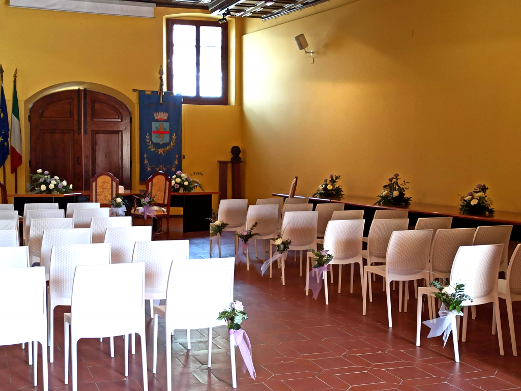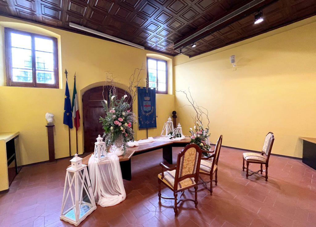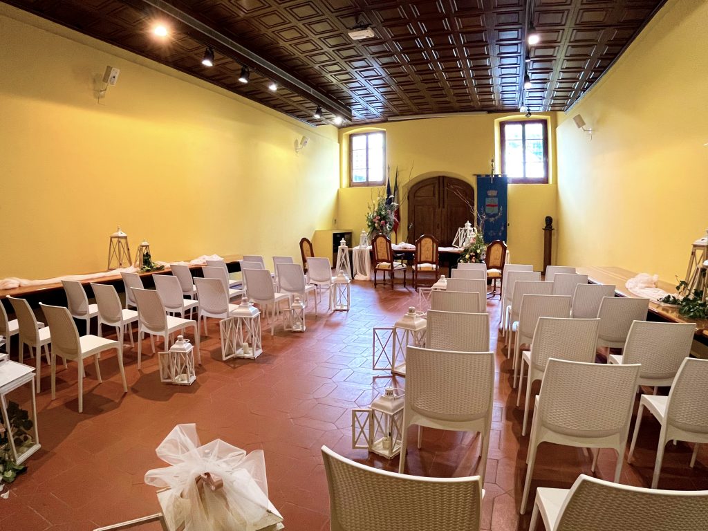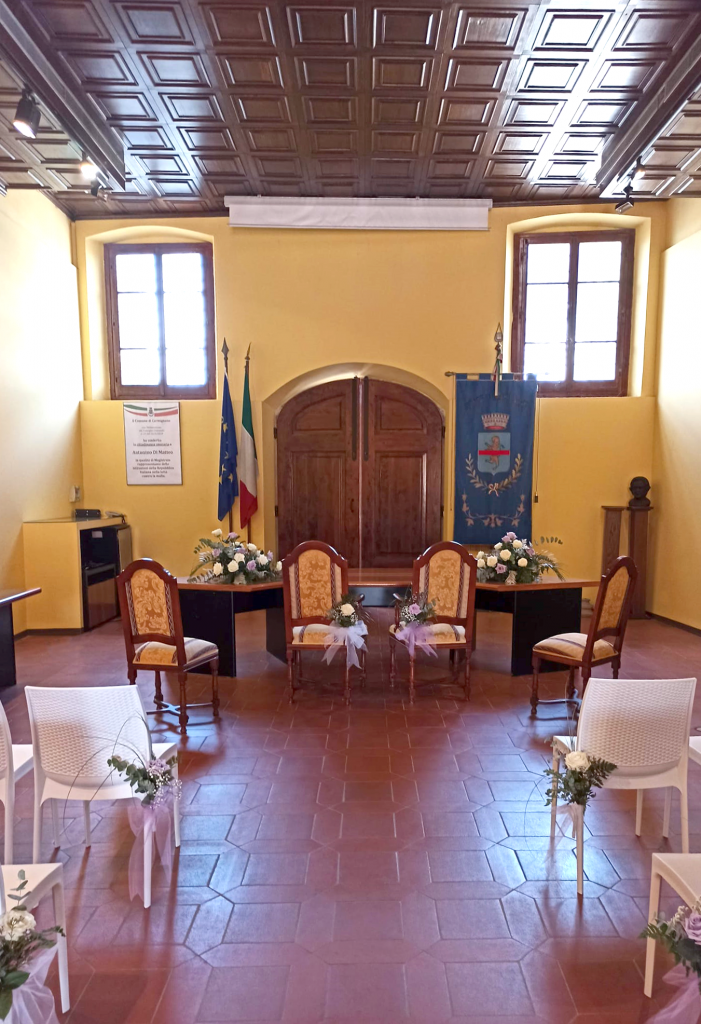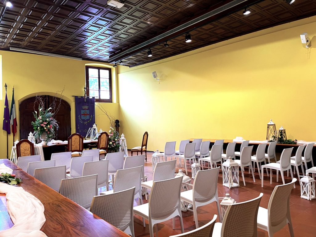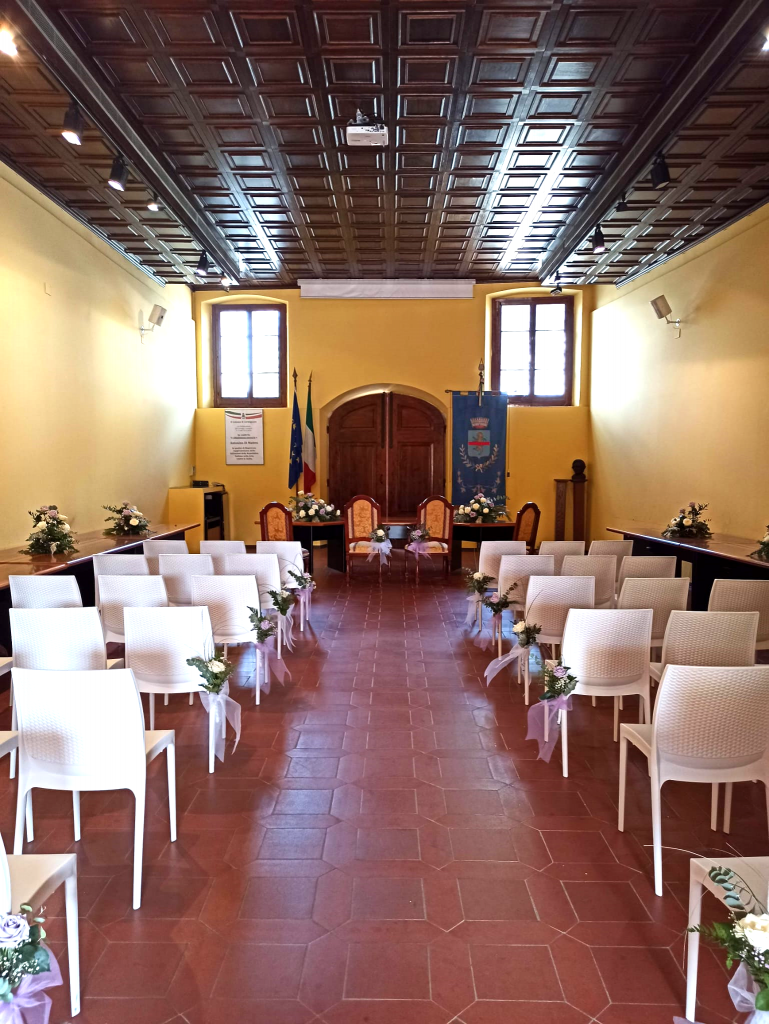 Realizzata in occasione dell’ampliamento del palazzo comunale e a una conseguente massiccia ristrutturazione, la Sala Consiliare nasce nei primi anni Novanta. Avendo il fine istituzionale di ospitare l’organo più alto dell’Amministrazione locale, ha un aspetto austero e sobrio, dunque perfetto per scambiarsi promesse eterne.