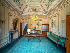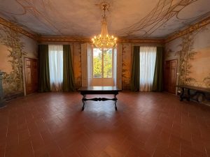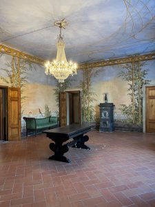 Particolarmente suggestivo è il salone d’ingresso, concepito come un vero e proprio gazebo dipinto: le pareti sono animate da motivi floreali, piante, viti e grappoli d’uva, accompagnati dalla presenza di un pappagallo raffigurato mentre si posa, trattenuto da una sottile catenella. Il soffitto evoca un cielo limpido, attraversato dal volo leggero di coppie di animali domestici, creando un ambiente luminoso e scenografico.